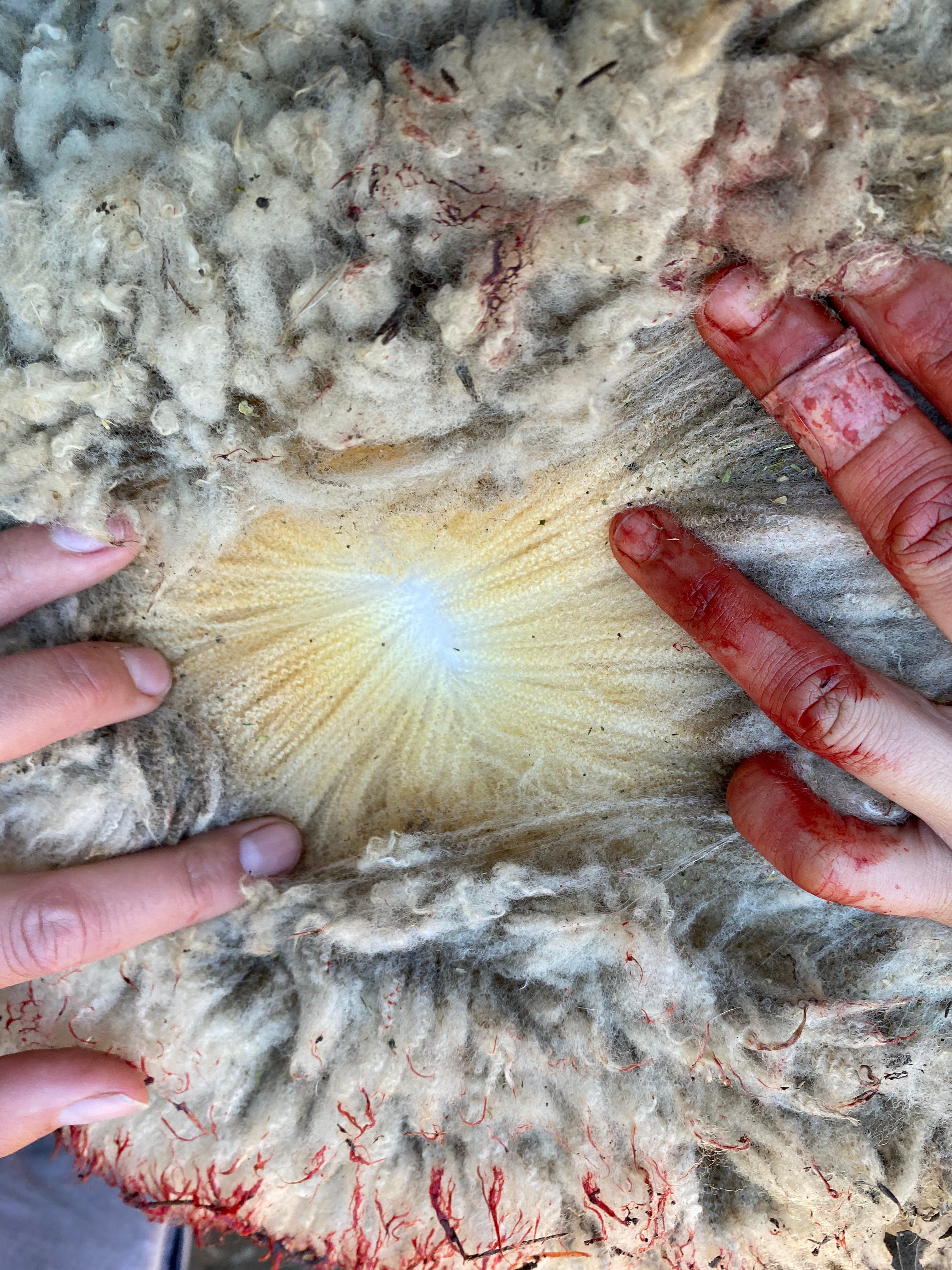 To finish removing the hide, you must reach an arm down into a ‘pocket’ in the sheep’s body cavity and use a fist to ‘punch out’ around the sheep’s back. So much of the vocabulary for slaughter and skinning is violent. Death throes, punching out—but the act didn’t feel violent.